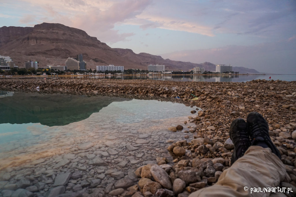 Niewiele osób się kąpie, niestety okazuje się, że jest ku temu dobry powód – woda ma ok. 17 stopni. Wykorzystuję wszystkie mi znane techniki relaksacyjne i uczę się paru nowych – dopiero wtedy udaje mi się zanurzyć. Leżąc obserwuję wczasowiczów. Ci, zaprawieni w bojach, leżą na leżaczkach i czytają książkę. Co rusz pojawia się jakiś nieświadomy letnik i scenariusz zawsze wygląda tak samo. „Wow, jak fajnie, Morze Martwe”, tutaj następuje pośpieszne przebieranie się w strój kąpielowy i, moja ulubiona część, wejście do wody, czyli zderzenie z lodowatą rzeczywistością. Potem nadchodzi zaduma, właściwe nastrojenie się i walka z zimnicą. W sumie, ja podążałem tym samym schematem. Po kąpieli idziemy na jedno ze spacerowych molo wchodzących w jezioro i podziwiamy jak Ein Bokek urzekająco odbija się w lustrze wody.
